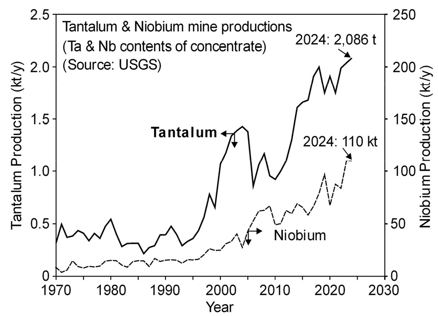- Global annual production of tantalum is only about 2,000 tons, yet it is an essential metal for modern industries and is considered a rare metal because it is mined in only a few regions. Tantalum powder and wire for capacitors account for roughly 30% of global demand, and tantalum is also used in superalloys, chemical processing equipment, semiconductors, and other high-performance applications. Because tantalum commonly occurs together with columbite and tantalite, the ores must be processed to separate Ta2O5 and Nb2O5. The metal tantalum is produced by metallothermic reduction and molten-salt electrolysis of halides, as well as thermal reduction of oxides. Crude tantalum is refined into high-purity metal using high-temperature vacuum heat treatment or electron-beam melting. Bulk scrap, such as spent tantalum sputtering targets, is recovered through electron-beam melting and related processes. However, tantalum used as an alloying element is generally not separated and recovered on its own; instead, the alloy is remelted as is. Since a large portion of tantalum is used in capacitors, recycling has become an area of significant interest. In practice, the capacitors are first thermally decomposed, after which the tantalum is recovered by metallurgical processes.
