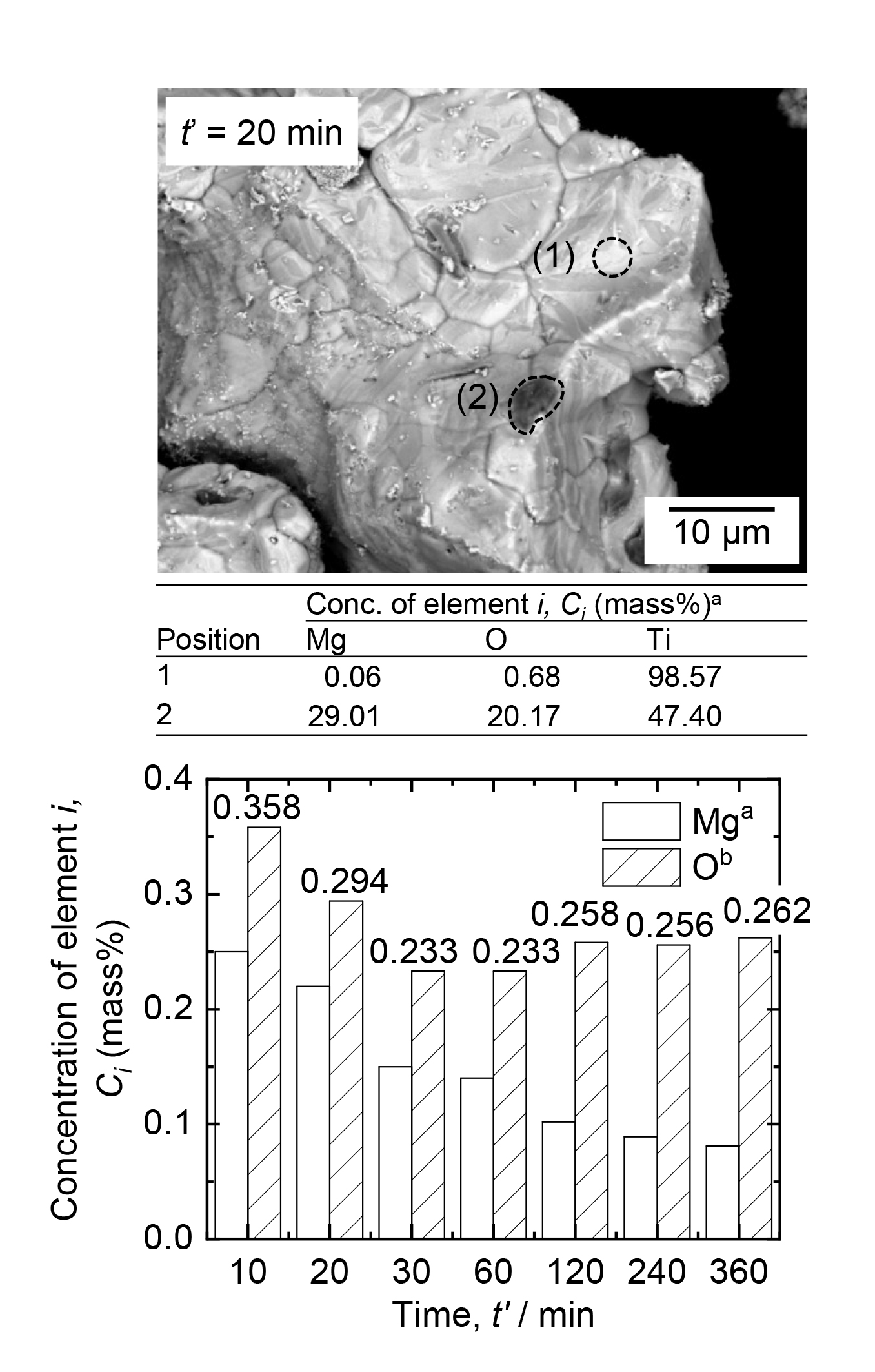 - To recycle off-grade Ti sponges, deoxidation using Mg in H2 gas has been recently developed. After deoxidation, acid leaching plays an important role in producing high-purity Ti without contamination by O. In this study, conditions for the HCl leaching of Ti mixtures obtained by deoxidation of an off-grade Ti sponge were optimized. The influences of leaching time, temperature, molarity of HCl solution, and bubbling gas on the O concentration in Ti were investigated, in addition to the dissolution behaviors of Mg, Ti, and Fe. When HCl leaching was conducted at 313 K under argon gas bubbling, the O concentration in Ti was 0.168 mass%, and the fractions of dissolved Ti and Fe were 1.01 % and 43.84 %, respectively. These results demonstrate the feasibility of mitigating O contamination in Ti with minimal Ti loss during the HCl leaching of a Ti mixture obtained after deoxidizing an off-grade Ti sponge.