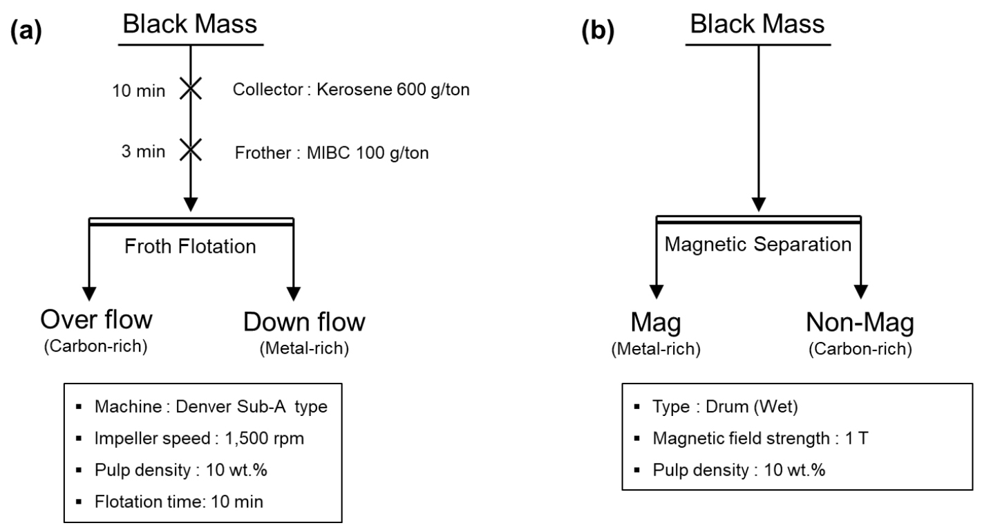 - In the recycling of spent lithium-ion batteries, the pretreatment process for recovering black mass generally consists of crushing and grinding, heat treatment to remove organic materials, and separation and classification to remove impurities. During heat treatment, depending on the heating temperature, the removal of organics, cathode reduction and lithium phase transformation can occur simultaneously. Therefore, this study discusses the fundamental separation characteristics of the cathode, anode, and lithium in a black mass associated with phase changes at the cathode reduction temperature. For this purpose, black mass was heat-treated at 550 ℃ for 2h under an N2 atmosphere, and the flotation and magnetic separation characteristics of the cathode and anode materials, as well as lithium leaching characteristics in aqueous solution, were examined. The results confirmed the removal of organics and the reduction of the cathode material. Compared to untreated black mass, the separation efficiency increased by approximately 43.9% in flotation and 69.3% in magnetic separation. In addition, aqueous leaching tests demonstrated that approximately 76.4% of the Li in the black mass was leached. These findings indicate that reductive heat treatment can significantly enhance the separation efficiency between the cathode and anode while enabling lithium recovery in the aqueous phase. The results of this study are expected to serve as fundamental data for developing optimal processes for separating the cathode, anode, and lithium from black mass under various heat-treatment conditions.